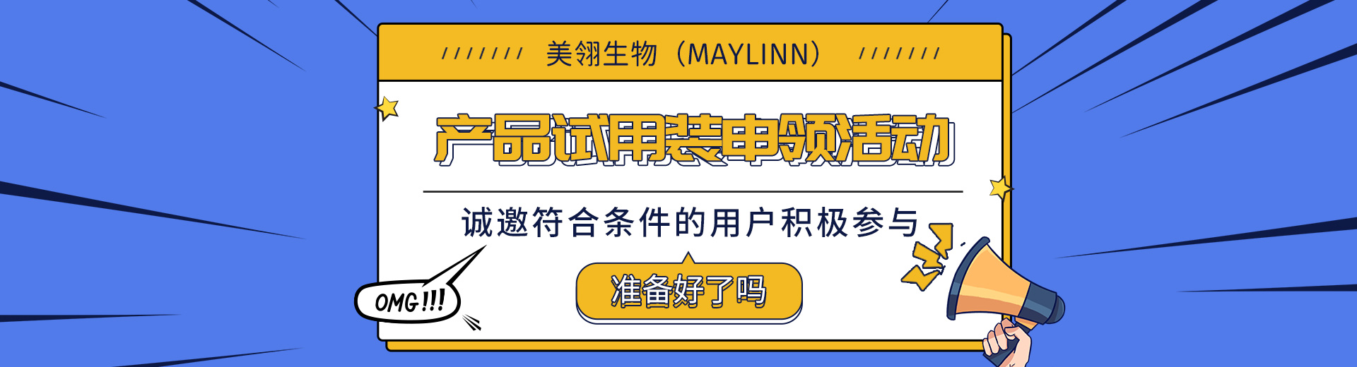 感谢您长期以来对美翎生物(MAYLINN)产品的关注与信任,为了让更多专业科研人员体验到我们的优质产品,同时精准收集产品使用反馈以持续优化品质,现正式启动全新升级的 MAYLINN 产品试用活动,诚邀符合条件的用户积极参与。