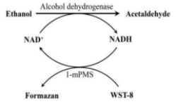 注:该操作是将样品中的NAD+通过乙醇脱氢酶作用转化成NADH,WST-8与NADH在电子耦合剂的作用下反应生成水溶性甲臜产物。