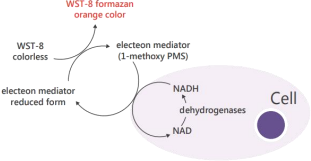 WST-8在电子耦合试剂存在的条件下,可以被线粒体内的脱氢酶还原生成高度水溶性的橙黄色的甲臜产物 (formazan)。颜色的深浅与细胞的增殖成正比,与细胞毒性成反比。使用酶标仪在450 nm波长处测定OD值,间接反映活细胞数量。工作原理见图 1。