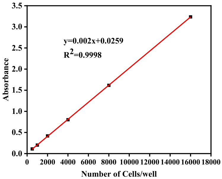 (3) 接种后培养2~4 h使细胞贴壁,然后每100 μL培养基加10 μL CCK-8试剂培养一定时间后测定OD值,制作出一条以细胞数量为横坐标,OD值为纵坐标的标准曲线。