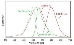 NucGreen/EthD-活死细菌双染试剂盒包含两种荧光染料,NucGreen是绿色核酸染料,可染色活细菌和死细菌;EthD-III是红色核酸染料,仅染色细胞膜受损的死细菌。将NucGreen和EthD-III适当混用,具有完整细胞膜的细菌呈现绿色,而具有受损细胞膜的细菌在不同通道下可分别呈现绿色和红色。本试剂盒适用于大部分的细菌类型的染色,可以用荧光显微镜或 者流式细胞仪进行检测。NucGreen和EthD-III的激发发射光谱请见产品参数。